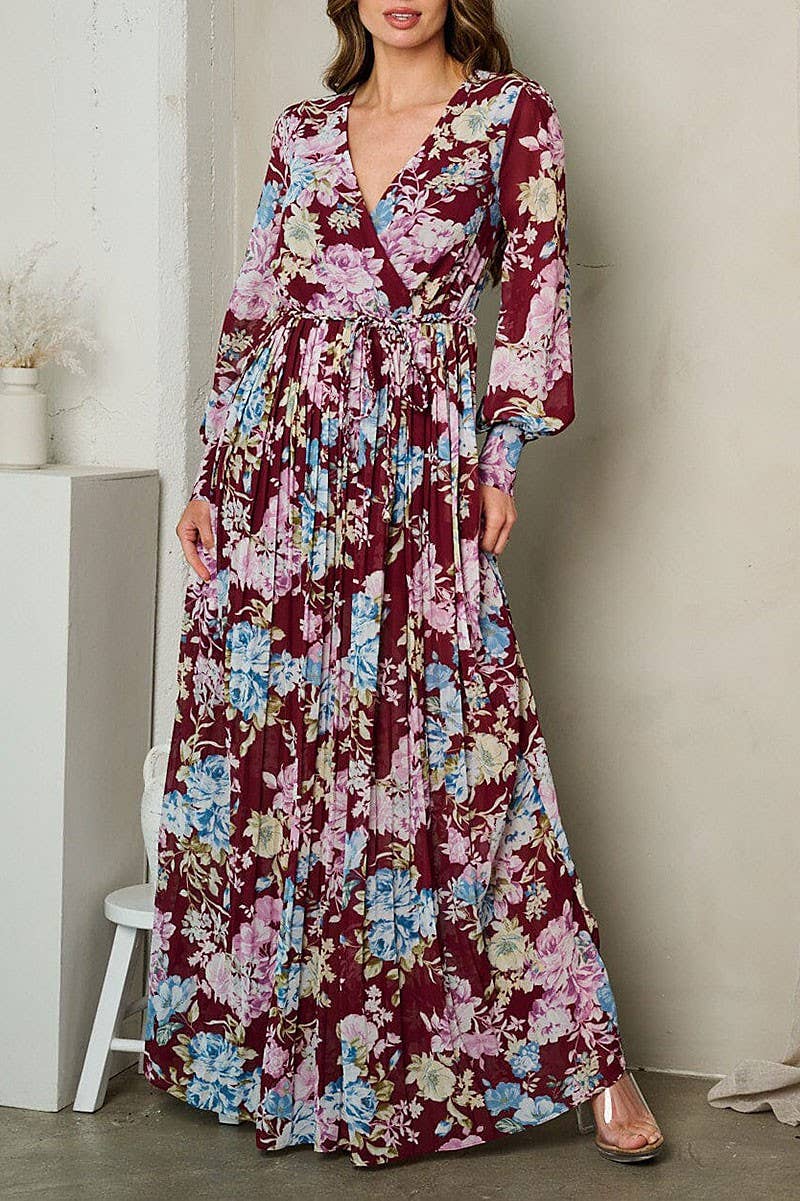 LONG SLEEVE SURPLICE SELF TIE FLORAL MAXI DRESS * 100% Polyester Lining: 100% Polyester. * Hand Wash.